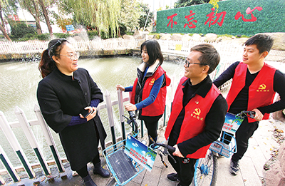 近年来,浙江台州市路桥区牢固树立“绿水青山就是金山银山”理念,坚持以党建为引领,以治水、护水为抓手,深入开展环保行动和环境综合整治。图为该区青年党员巡查河道并宣传环保知识。