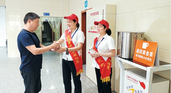 近年来,浙江开化县着力发挥党员的先锋模范作用,积极开展“党员志愿行,服务零距离”活动。图为近日,该县红帽子党员志愿者服务队在县汽车客运南站候车室给旅客送上消暑茶水。