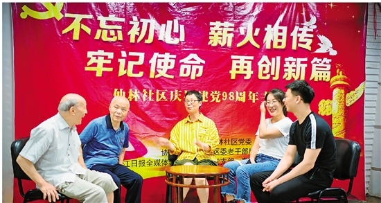 6月25日下午,在杭州仙林社区,浙江日报全媒体编辑中心第一党支部的党员和仙林社区的老党员齐聚一堂,开展庆祝建党98周年“不忘初心,薪火相传,牢记使命,再创新篇”主题活动。图为老党员青年党员共话初心。