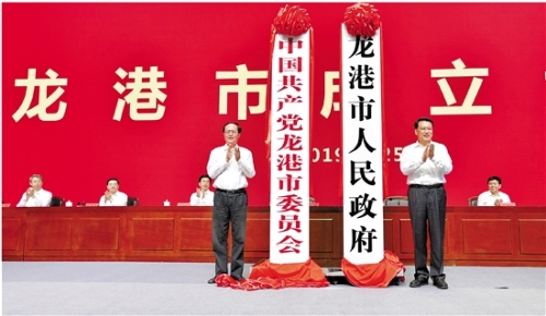 会上,省委书记车俊,省委副书记、省长袁家军为“中国共产党龙港市委员会”“龙港市人民政府”揭牌。陈金彪、黄建发出席,陈伟俊和龙港撤镇设市工作筹备组组长作了发言,王文序宣读了省政府关于撤销龙港镇设立县级龙港市的文件。