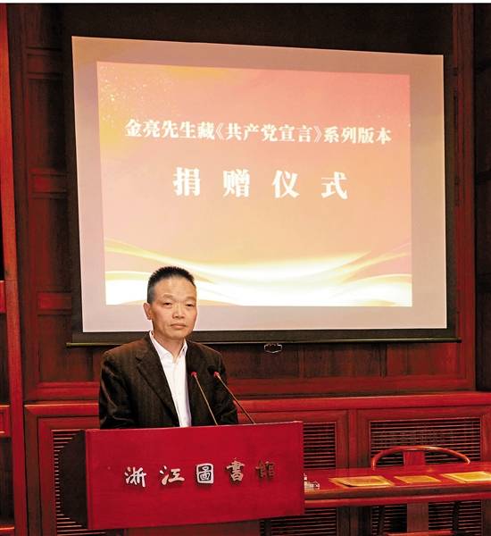 近日,浙江省委党校政治学教研部教授王景玉再次来到浙江省委宣传部,了解《共产党宣言》系列版本的整理情况。不久前,浙江收藏界与党史学界因一则捐赠消息引起不小的轰动——11月28日,恩格斯诞辰200周年纪念日当天,省委宣传部收到了浙江奥特莱斯广场有限公司董事长金亮捐赠的1140多种版本《共产党宣言》。其中有图书、漫画、音频等,基本涵盖了1888年至今全世界出版的各语种版本。