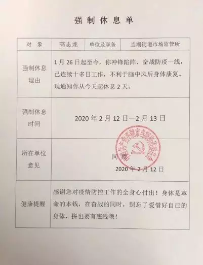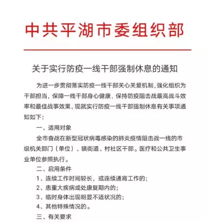 抗疫是场攻坚战,为了让基层干部身体健康有保障,保证持续有力抗击疫情,平湖市委组织部近期发出《关于平湖市防疫一线干部强制休息的通知》,高志龙就是全市首位接到《强制休息通知单》的干部。