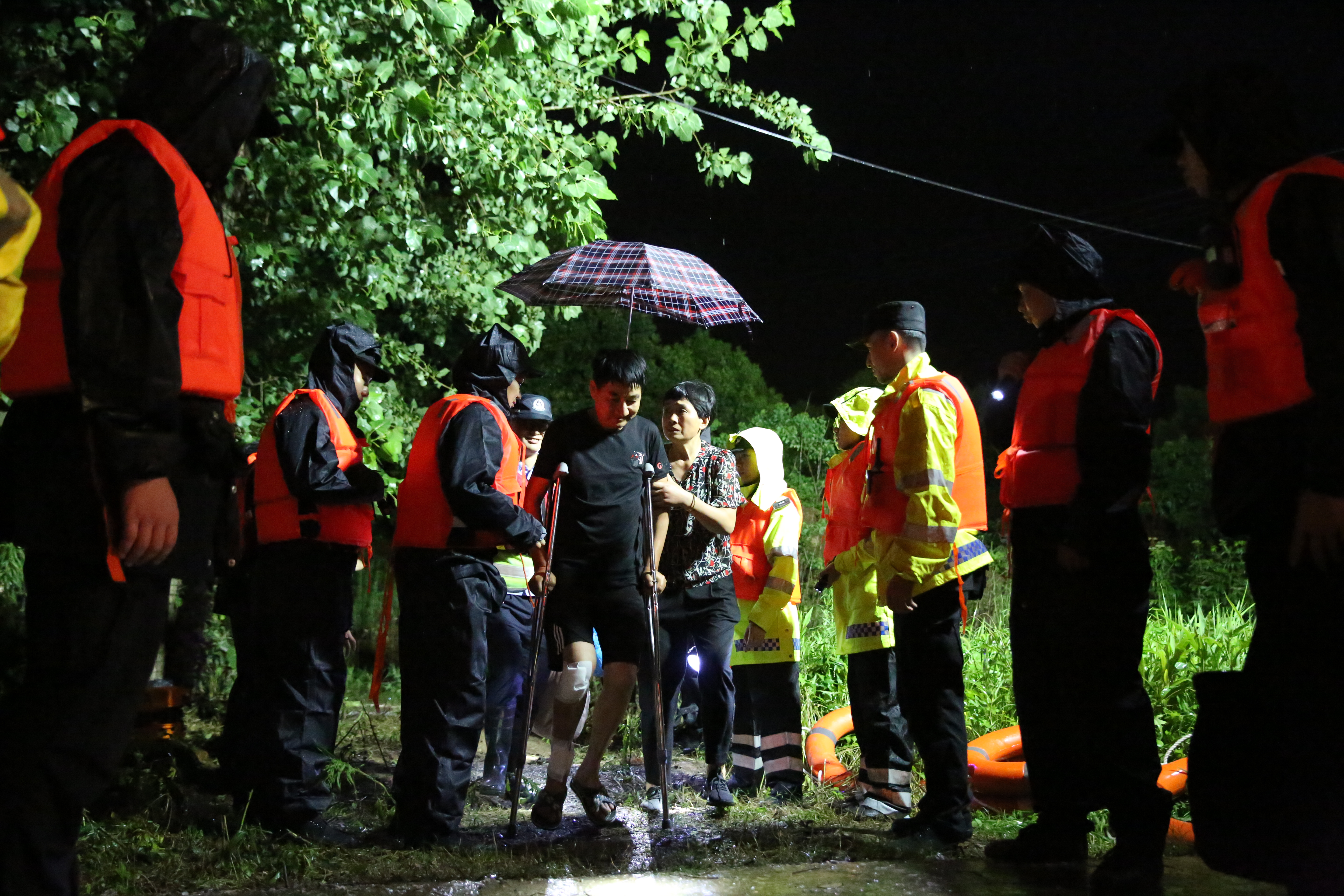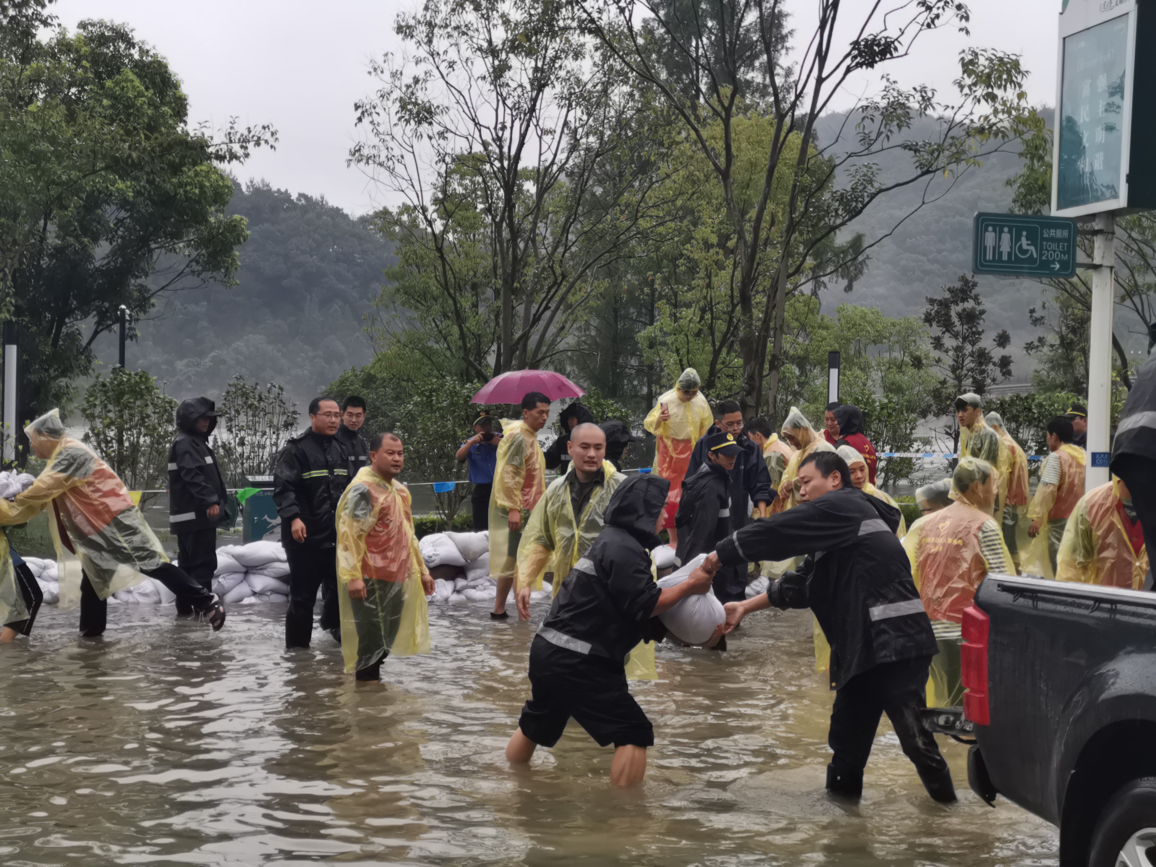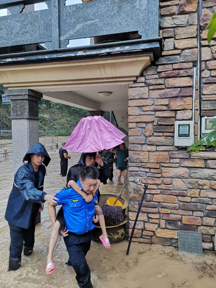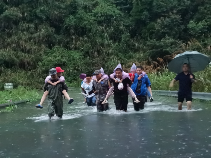 “孩子们别怕!”在淳安县梓桐镇,党委政府紧急组织党员干部及村里民兵开展人员转移,发现滞留在农业观光园参加夏令营的学生和老师被围困,党员干部蹚着倒灌的湖水,迅速转移学生67名、老师14名。