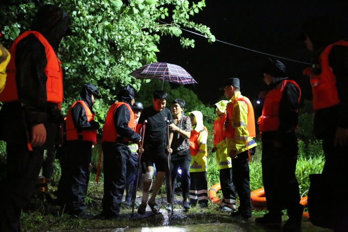 7月7日上午3点至6点,合村乡三源村雨量达75毫米。三源村外黄山自然村路面大量进水,村里的5户农家一楼进水被困,水位持续上涨,合村乡党委副书记、乡长姚者新、党委委员、副乡长徐成等带头组织全乡党员干部第一时间开展救援,借来橡皮艇,直接蹚水将5户人家9个村民全部转移到安全地带。