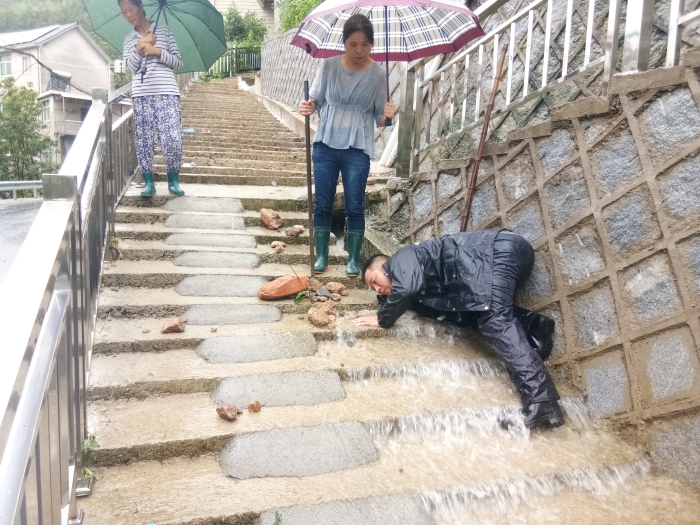 “书记,我家前面有个涵洞堵住了,水下不去都往路上来了!”已经奋战一夜的临安区龙岗镇望湖村党支部书记姚铨江二话不说,立即赶到现场,不顾大雨立马侧卧在雨水漫灌的台阶上,用手把堵塞的杂物和石头一块块掏出,雨衣和套鞋里灌满了水也浑然不知。