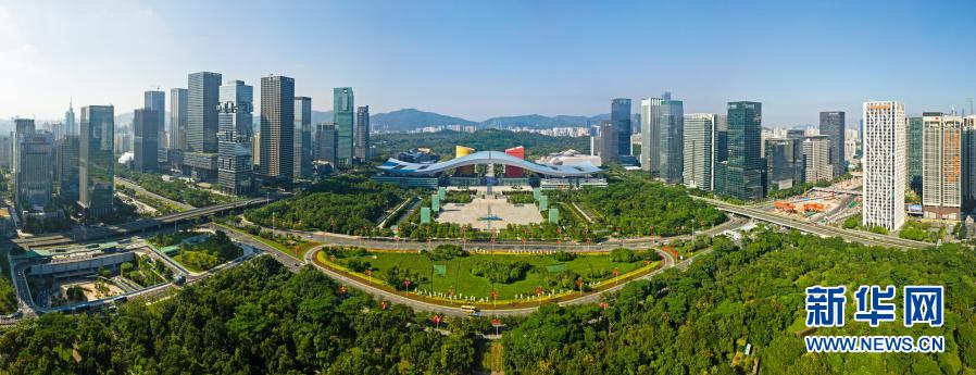 这是2020年10月2日拍摄的深圳市民中心和莲花山公园一线(无人机照片)。新华社记者 梁旭 摄