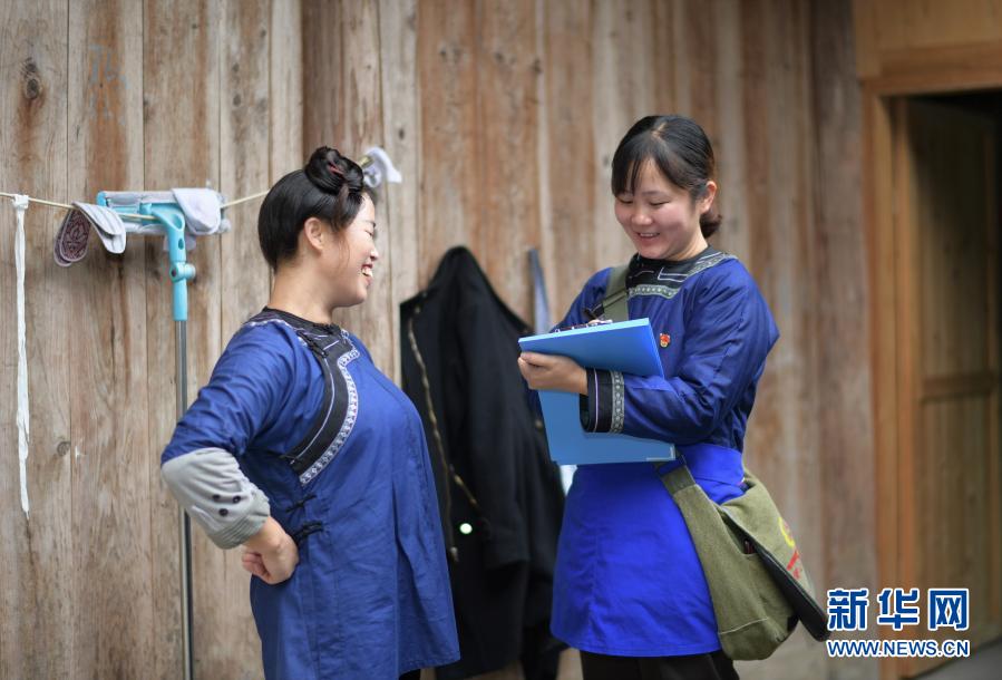 贵州省黔东南苗族侗族自治州榕江县平江镇巴鲁村网格员刘园(右)走访结对帮扶户时,与村民韦福琴核对生产生活情况(2020年11月16日摄)。新华社记者 杨楹 摄