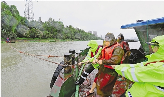 7月22日15时,环太湖区域实施联动封航,不少船舶进入锚泊区停泊避风。25日上午,位于杭湖锡线湖州长兜港的太湖避风锚泊区内已聚集200多艘滞留船只。上午10点,随着湖州船闸关闸,东、西苕溪河水汇流太湖导致水流加速,给锚泊区船只带来安全隐患。湖州市交通运输综合行政执法队太湖水上中队队员叶学军、陈贵平等人开着巡逻船,逐一检查船只缆绳是否牢固。巡查中,几艘捆绑停靠在一起的重载货船眼看就要被大风急流冲到航道中央,叶学军、陈贵平立即和船主一起做好加固,防止船只走锚漂移。