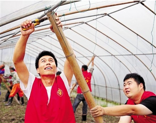 9月12日,德清县乾元镇联星村蔬菜基地,党员、平安志愿者和人大代表等帮助菜农加固蔬菜大棚,应对台风“灿都”可能带来的影响。 拍友 倪立芳 张燕 摄