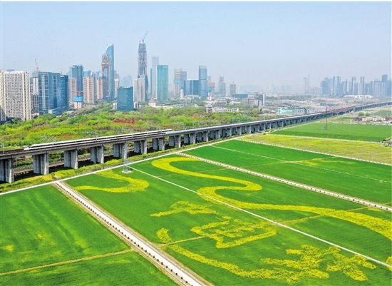 4月7日,杭州市萧山区,一趟高铁列车从绘有“中国梦”字样的油菜花田边疾驰而过。行驶的动车组、金色的油菜花,构成一幅美丽的春日画卷。 记者 董旭明 摄